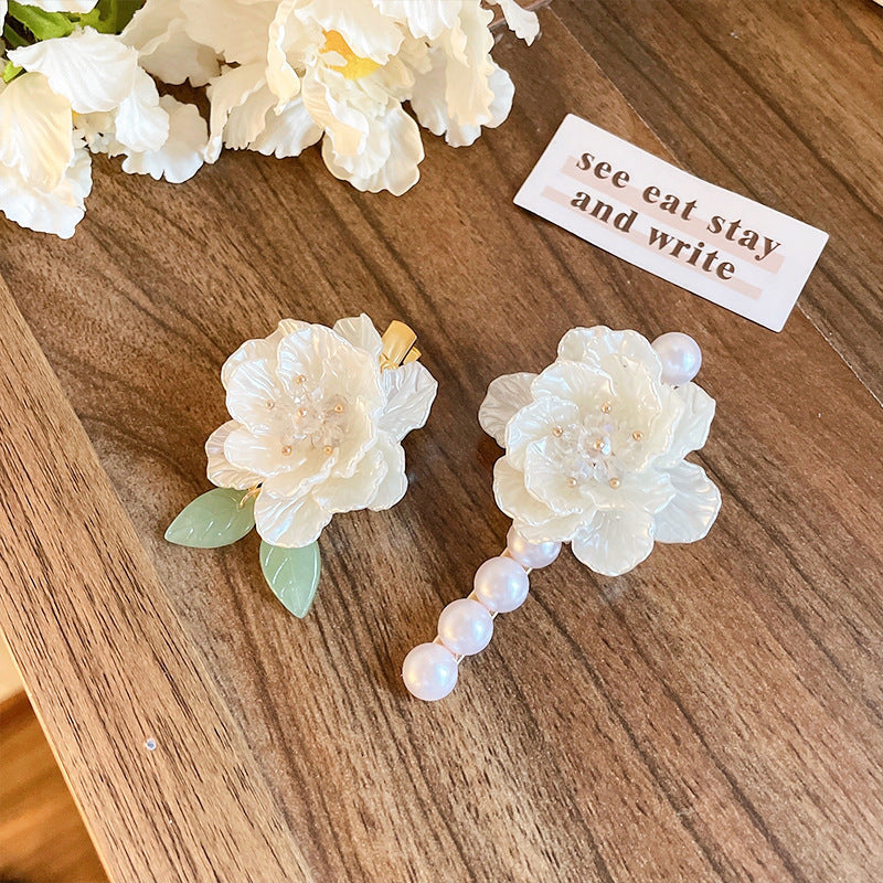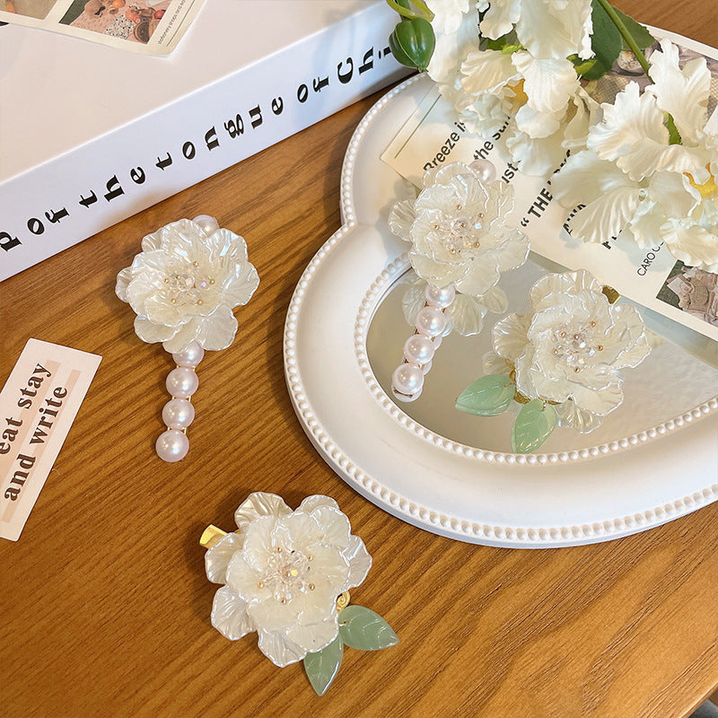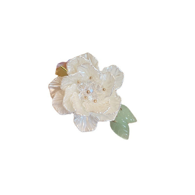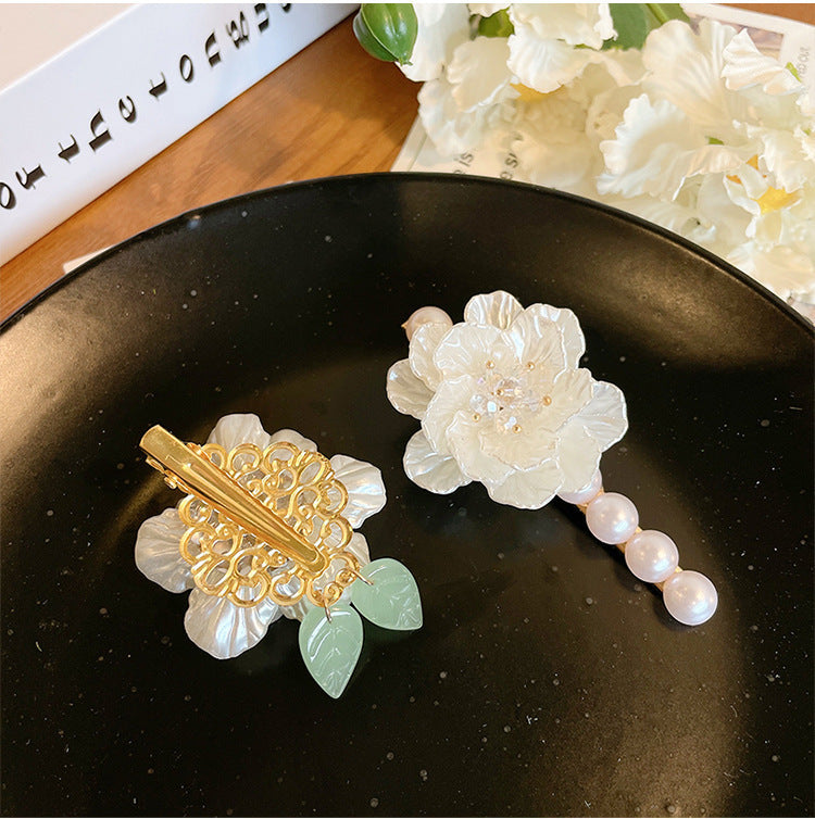 Color: Camellia green leaf duckbill clip, Camellia Pearl duckbill clip